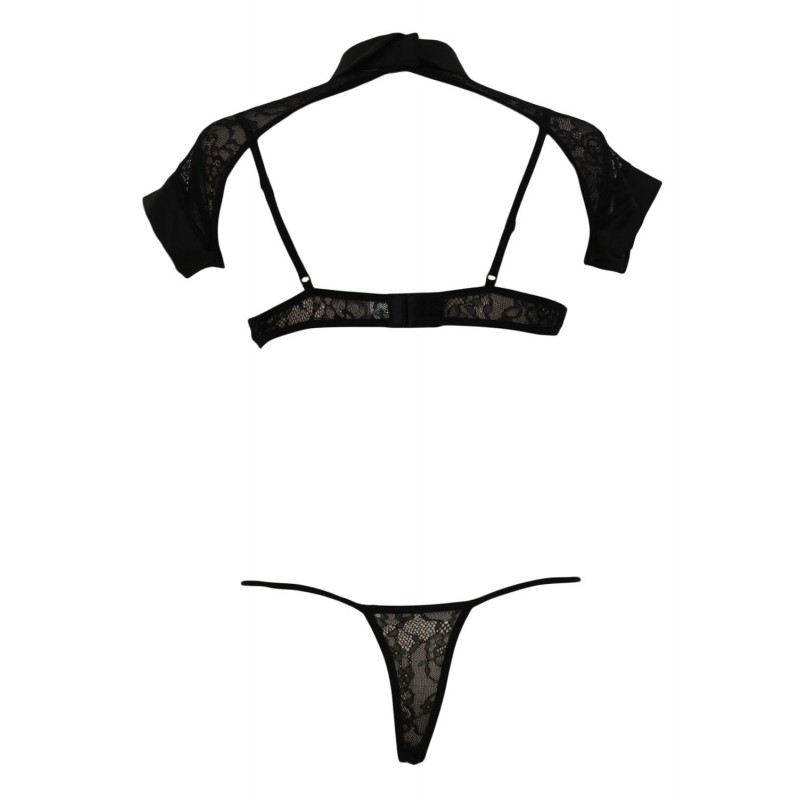 Romance continues with this sweetly designed set and let your fantasies run wild! The ultimate in flirtation, this provocative teddy set is crafted to contour the body with an intoxicating look. A built-in split cup bra for even more appeal, sheer cropped lace blouse with thong.